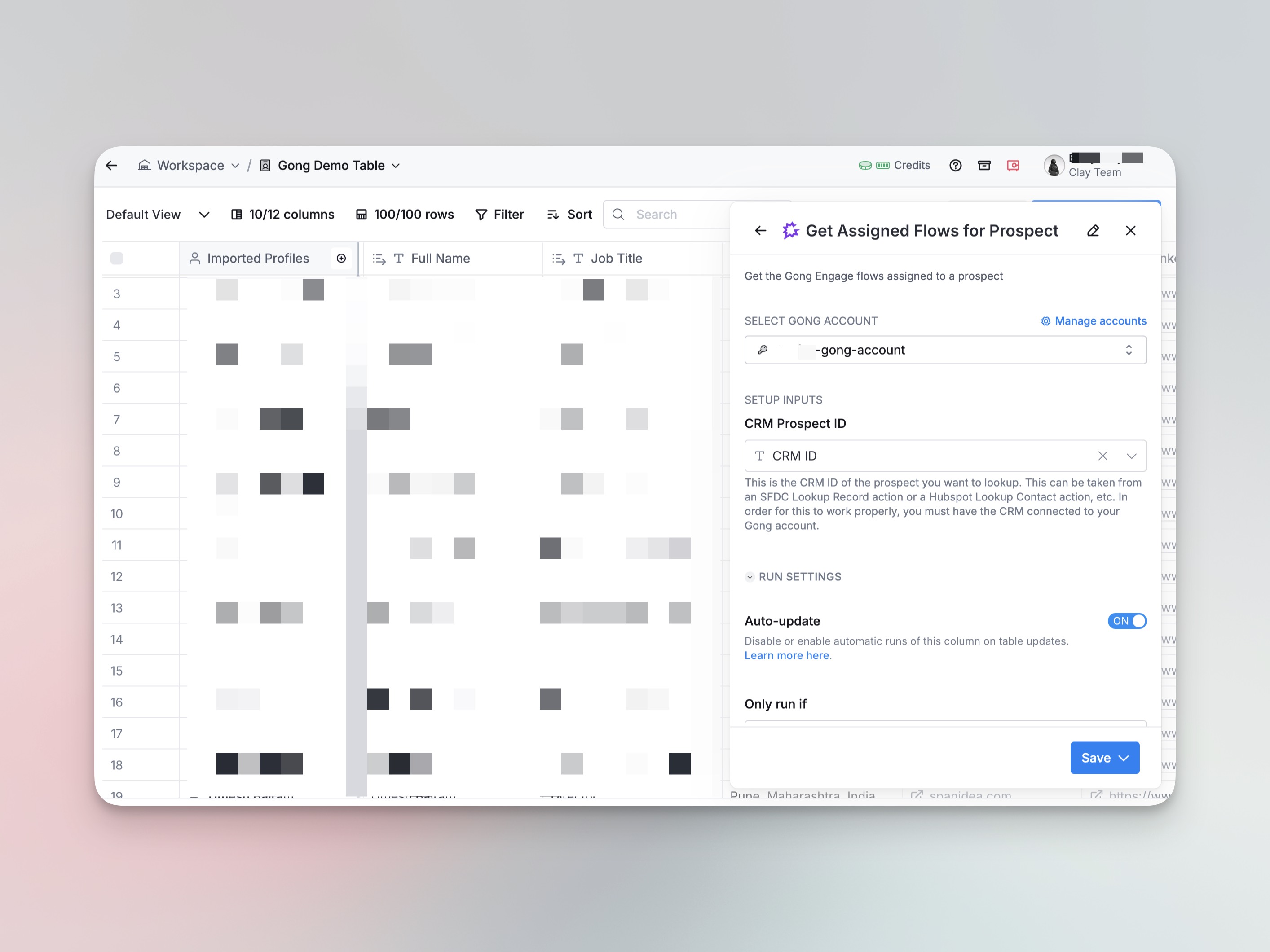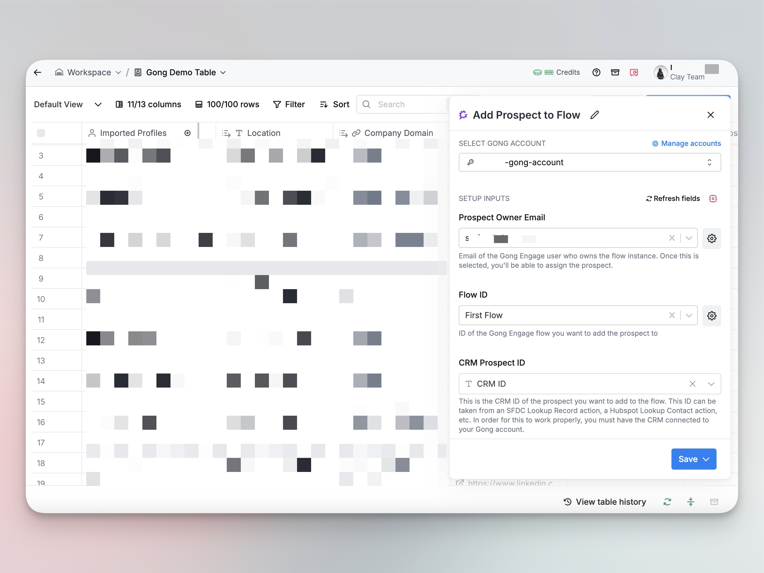 - Once authorized, you can seamlessly access your Gong account within Clay tables.