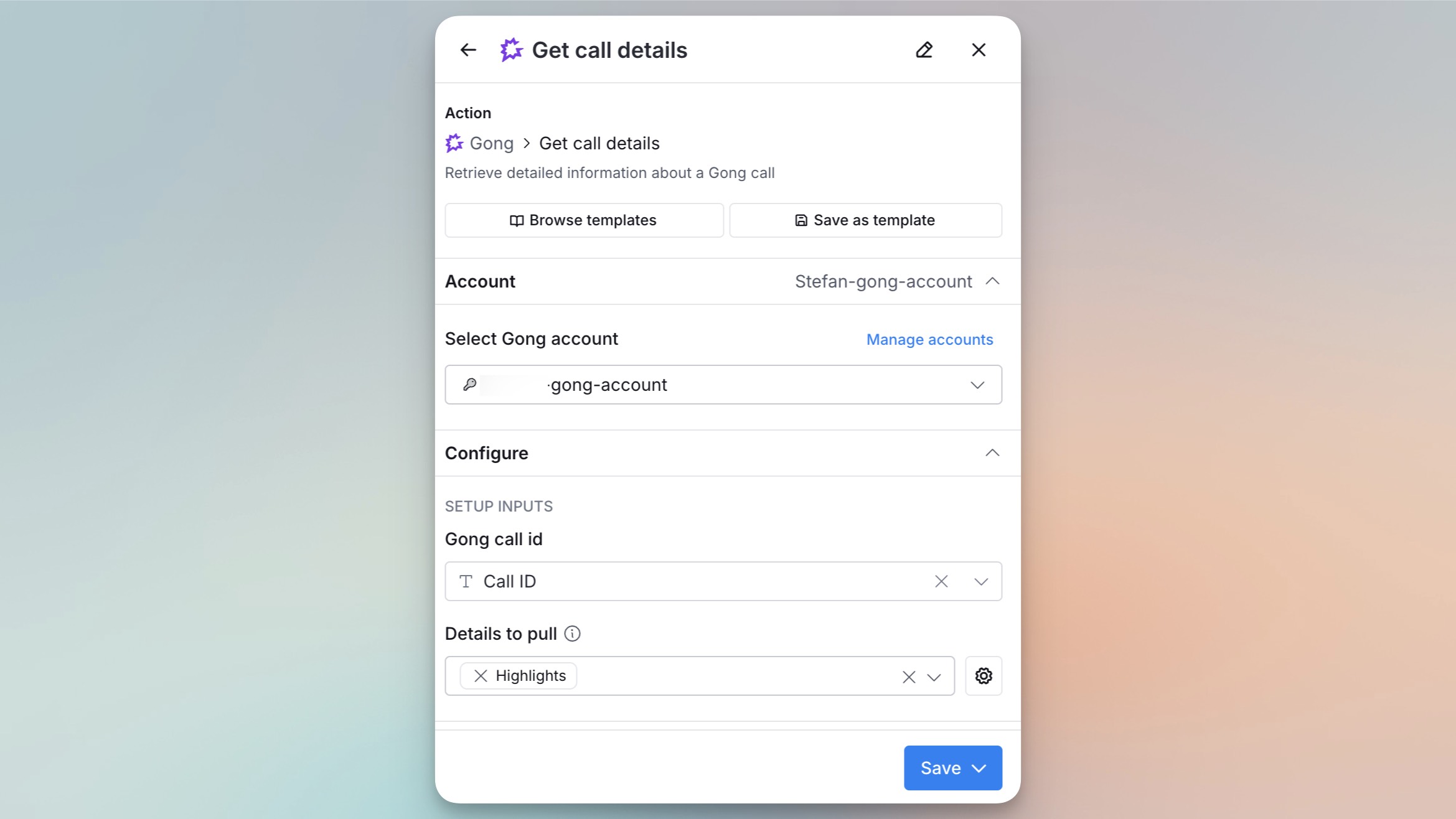 - Within the Gong action, click Add account.