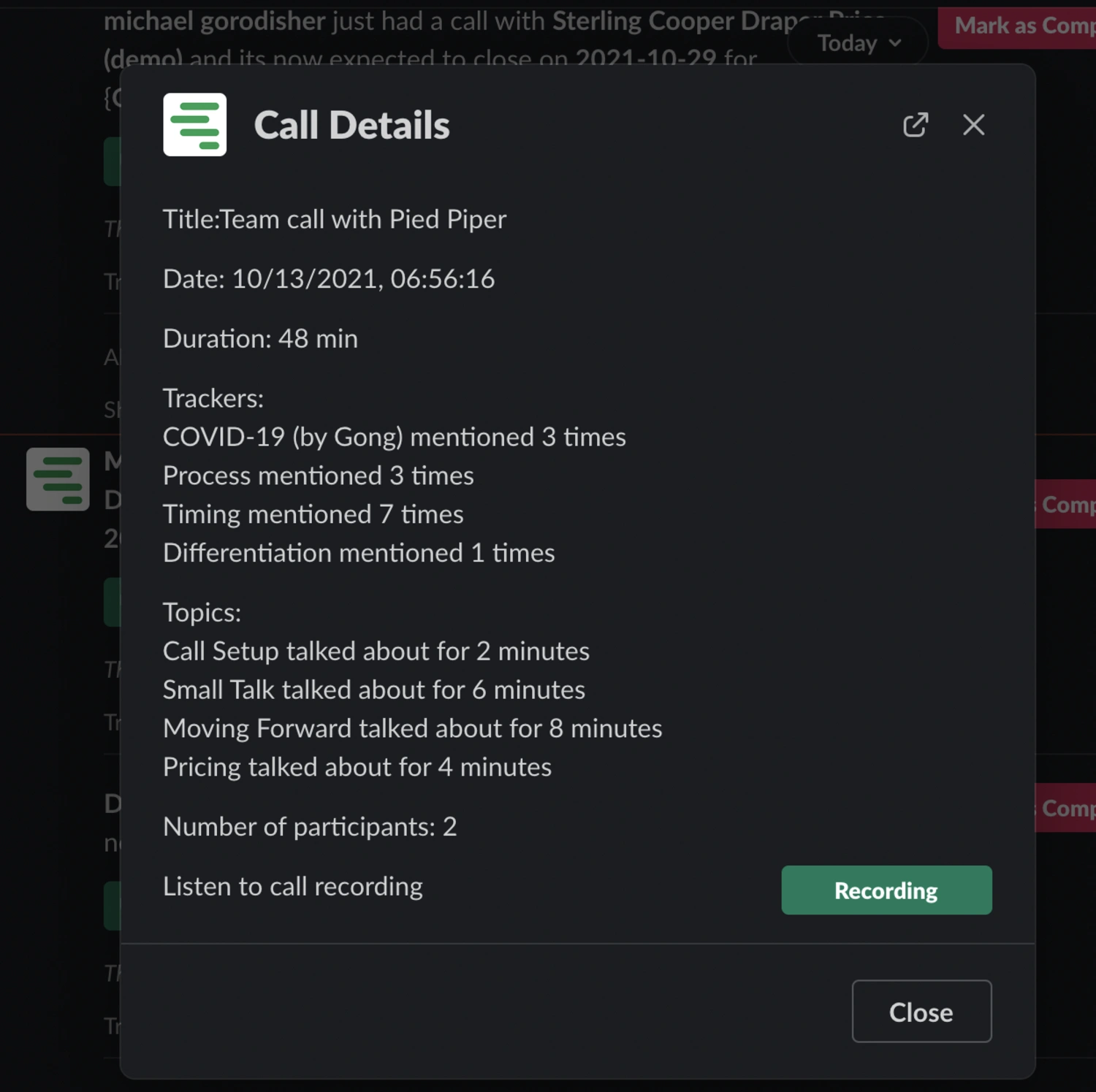 - Access Gong call insights from a meeting recap