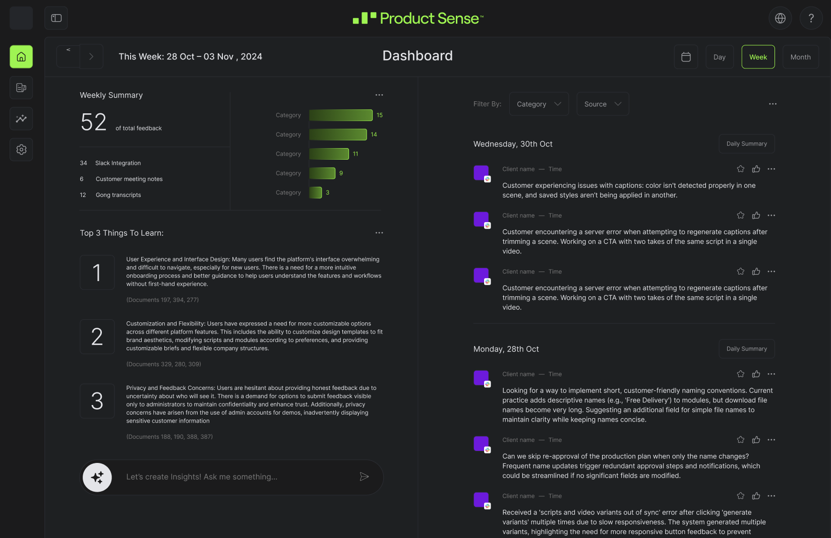 With ProductSense you can manage whole product management process in one tool, all a way from extracting meaningful insights from calls and messages to deciding what to build and launching product successfully.